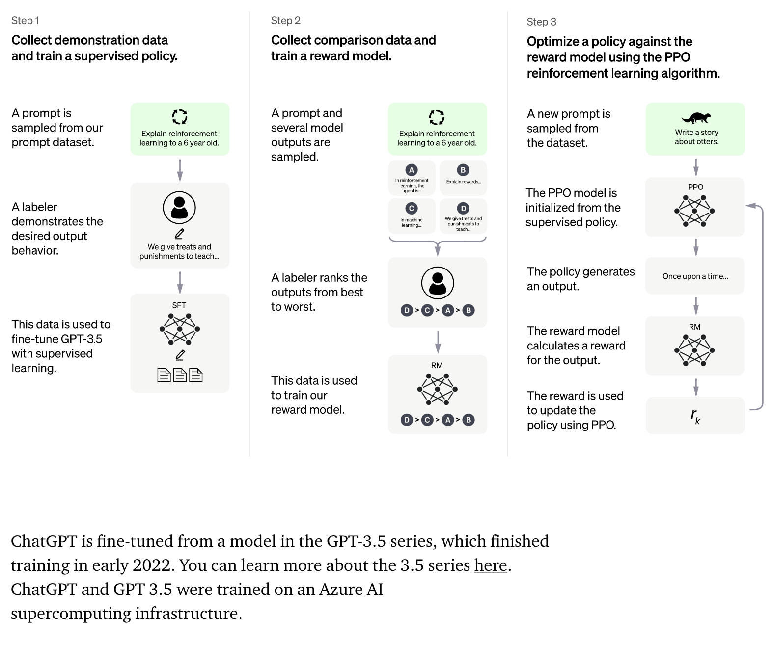 OpenAI 홈페이지 블로그 게시글을 보면, ChatGPT는 2022년 초반에 트레이닝을 완료한 GPT 3.5 시리즈 모델을 사용한다고