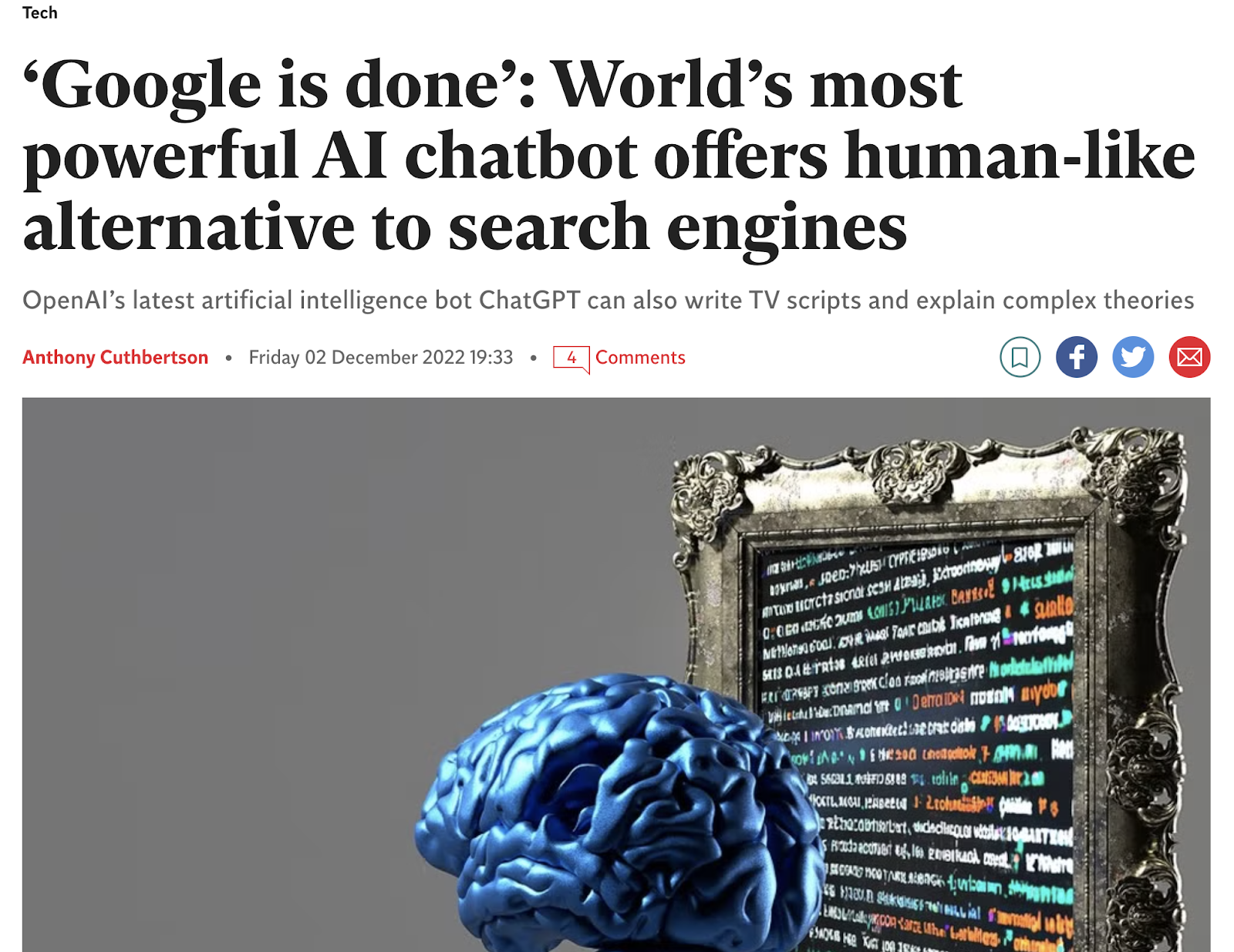 영국 일간지 인디펜던트는 ChatGPT가 공개된 다음날 “Google is done”(구글은 끝났다)라는 제목의 기사를 올렸습니다. Google과 ChatGPT의 응답을 다양한 쿼리와 비교한 앱 개발자 Josh Kelly의 트윗을 인용한 것으로 보이는데요. 자극적으로