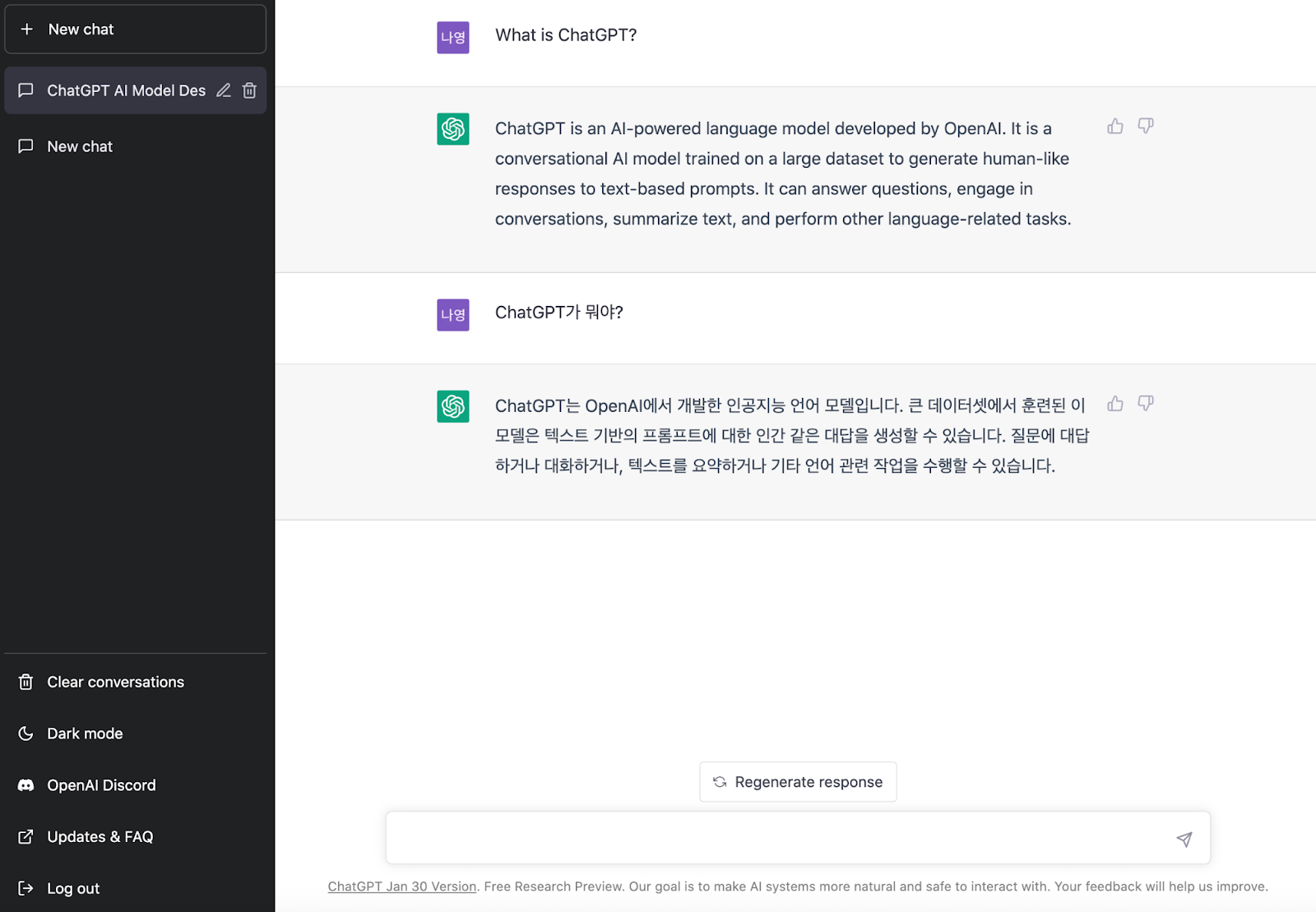 ChatGPT에 ChatGPT가 뭔지 영어와 한국어로 각각 질문을 해보았습니다.