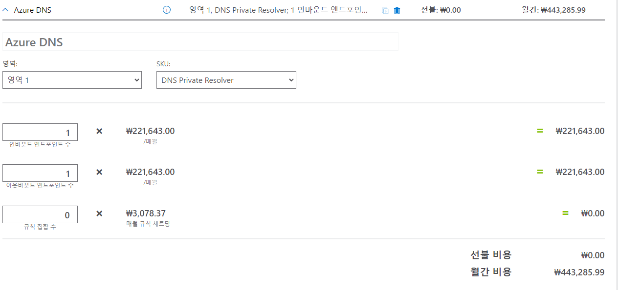 다음으로 비용은 어느정도 나올지 측정해 보았습니다. DNS Forwarder 역할을 수행하는 Inbound Endpoint는 20만원의 가격이 소요됨을 확인할 수 있어요.