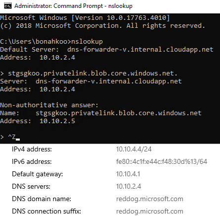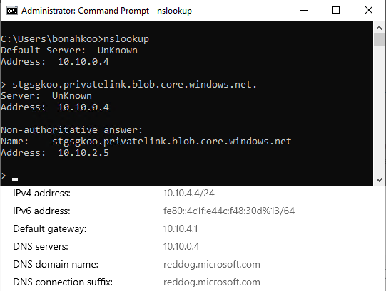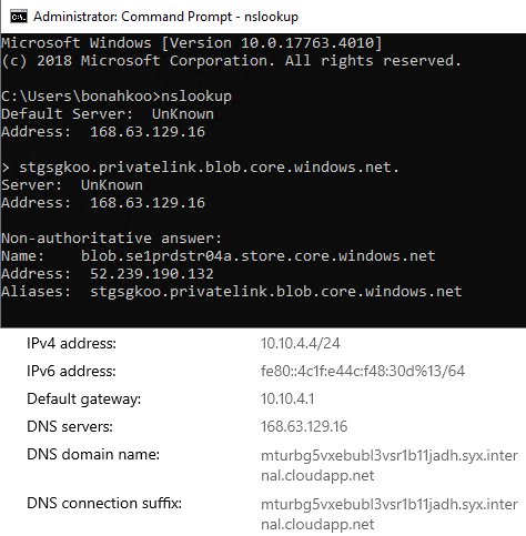 DNS Forwarder로 구성한 VM은 DNS 질의가 오는 것에 대해 Azure Provided DNS인 168.63.129.16으로 전달하게 되고, 다음과 같이 Blob의 Private DNS를 얻을 수 있음을 확인할 수 있어요.