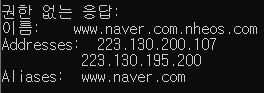 nslookup을 진행하여 확인한 www.naver.com의 서비스 IP 이러한 DNS는 외부적으로도 사용하지만, 내부적으로 사용하는 DNS들도 있어요.