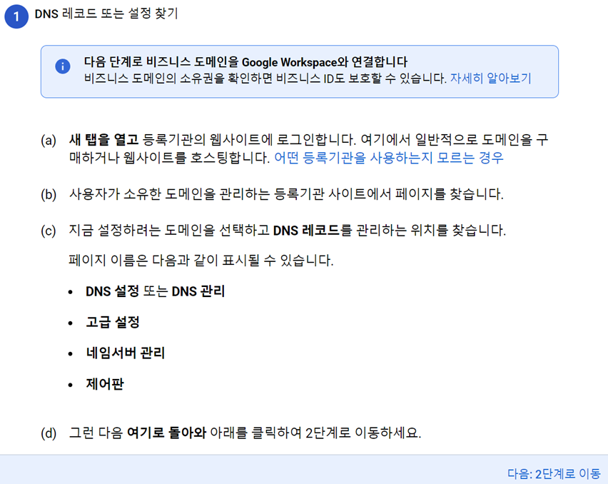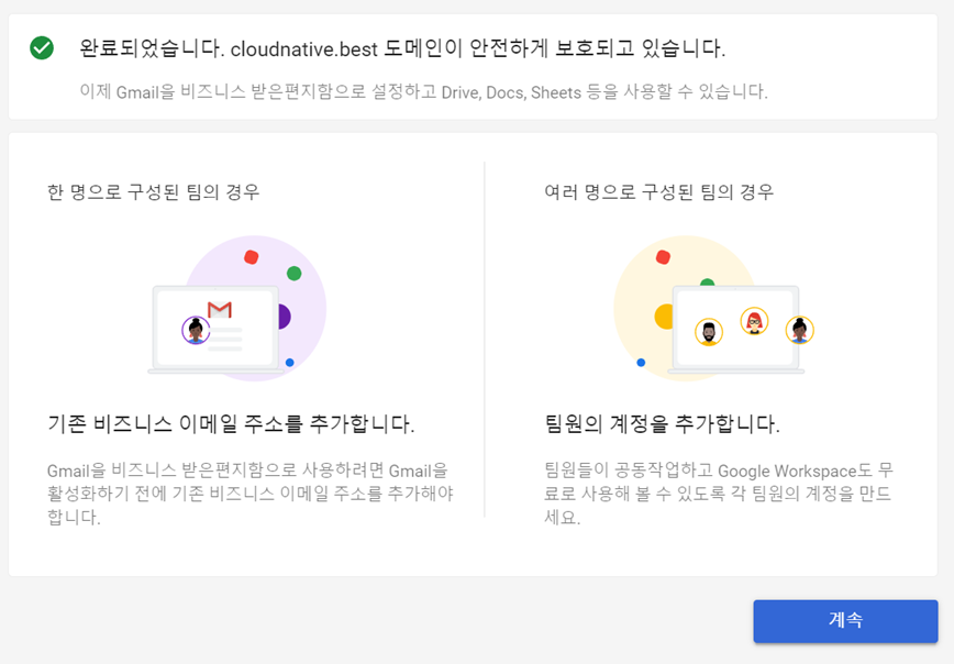 인증 레코드를 추가한 후 Google Admin 콘솔로 돌아와 다음 단계로 넘어갑니다. 도메인 인증에는 최대 5분이 소요되며, 인증이 완료되면 아래와 같은 화면이 나타납니다.