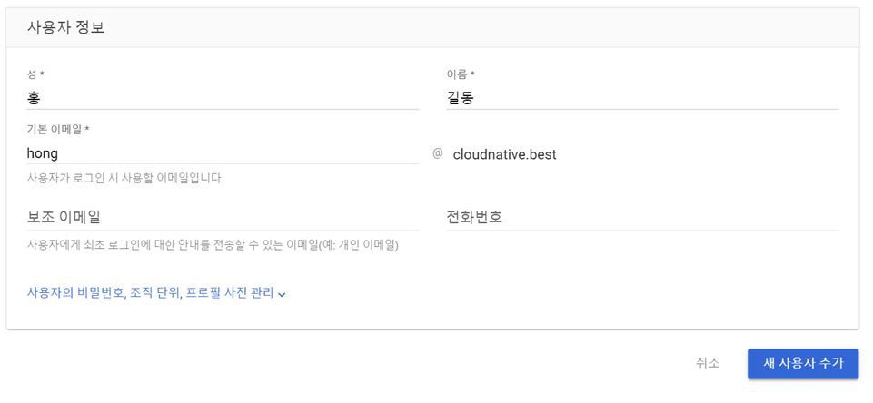 이제 홍길동 이라는 가상의 사용자를 팀에 추가해 보겠습니다. 사용자 이름과 사용자가 앞으로 Google Cloud 콘솔에 로그인 할 때 사용할 이메일 주소를 기입합니다. 신규 사용자에게 최초 로그인하기 위한 안내를 하려면 ‘보조 이메일’ 주소를 추가로 입력합니다.