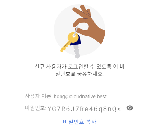 새 사용자 추가 후 아래처럼 임의의 비밀번호가 자동으로 생성됩니다. 정상적으로 계정이 생성되었는지 테스트하기 위해 시크릿 창을 열어 로그인해보겠습니다.